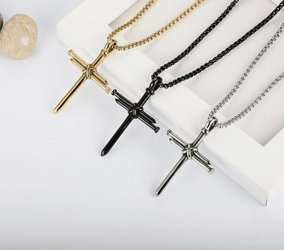 This bold cross necklace—crafted from nail-shaped pieces—beautifully symbolizes Christ’s sacrifice. Masculine and meaningful, it’s a powerful way for a Christian man to express his faith.